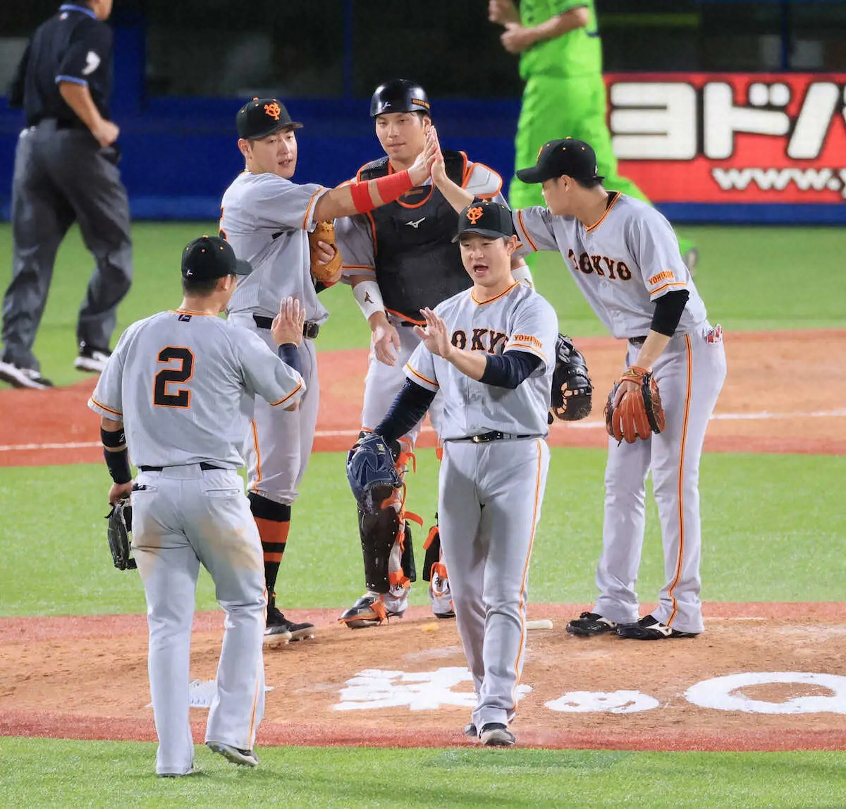 <ヤ・巨>勝利を喜び合う巨人ナイン(撮影・尾崎 有希)