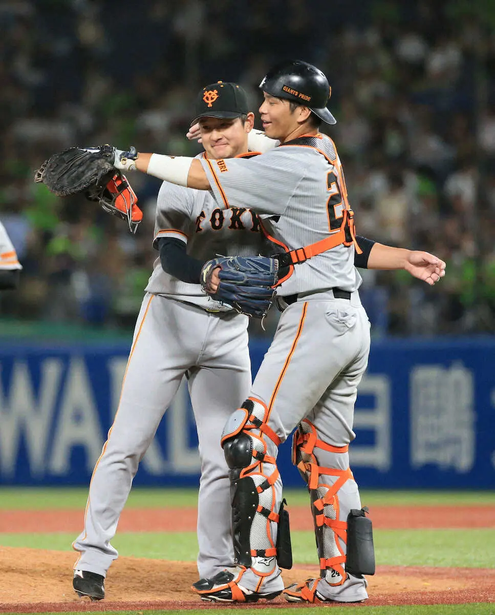 8回に丸の左犠飛で同点に追いつき、9回に吉川の気迫の走塁と重信の執念の二ゴロで勝ち越し。この試合初めてリードを奪って迎えた9回を“代役守護神”の中川がしっかりと締めた。山田、村上の中軸を打ち取り守った1点。勝利を決め大城卓と熱い抱擁を交わした。