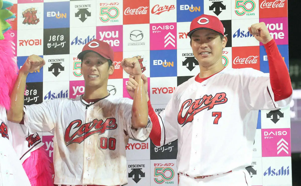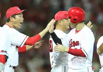 前進守備を敷くDeNAの中堅手・桑原の返球をかいくぐり、二塁走者の曽根が俊足を飛ばして猛然と突っ込んだ本塁クロスプレー。敵将・三浦監督のリクエストは覆らず判定通り生還が認められると、堂林の周りに歓喜の輪が広がった。