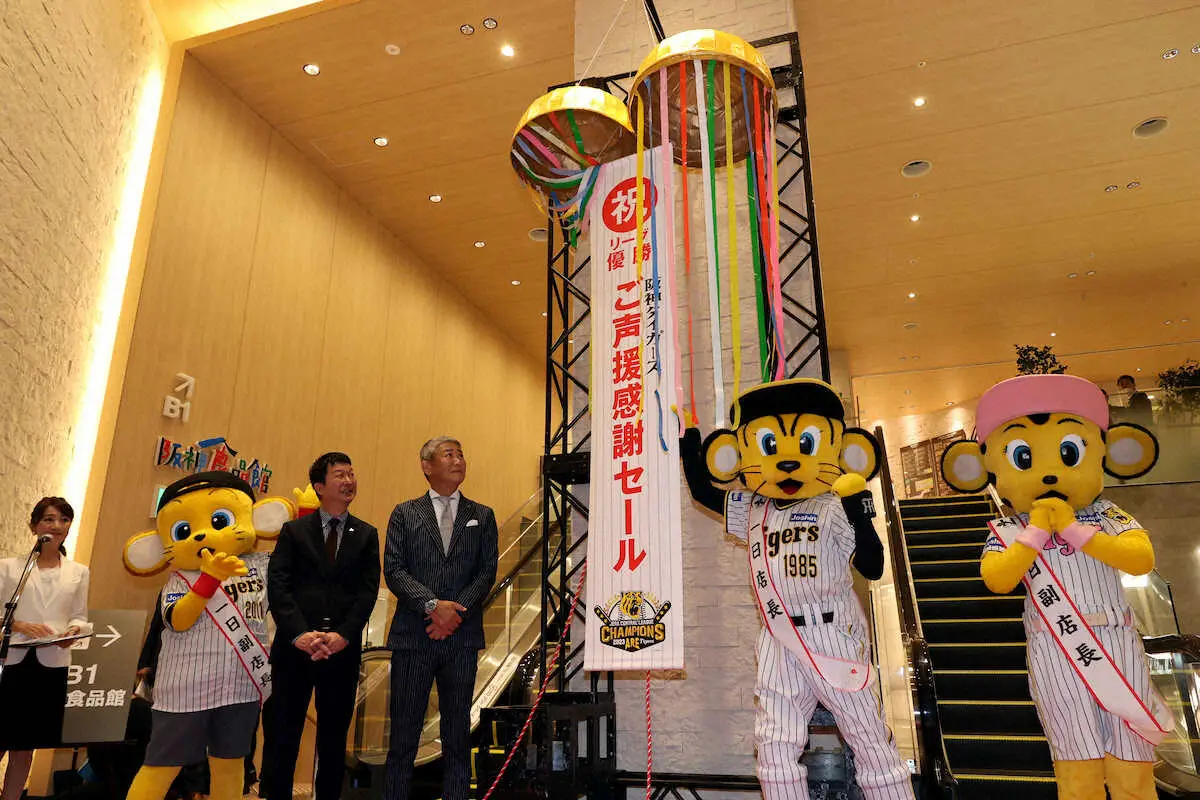 阪神百貨店では開店前に2000人が列を作り、午前10時の開店時間を30分早めて優勝セールがスタート。球団マスコットのトラッキーらが参加してのセレモニーが行われる中、1800円の福袋など18年ぶりにちなんだ商品に人気が集まった。球団オンラインショップでも、ビールかけTシャツなど優勝記念商品の先行販売が始まった。人気ラーメン店「どうとんぼり神座」の大阪市内の店舗では「おかだ」「あきのぶ」の名前の人に先着100人無料サービスを実施するなど、各地でお祝いムードがあふれた。