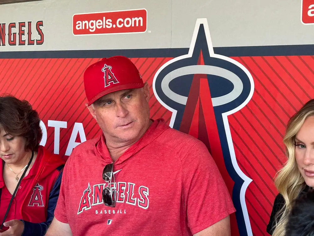 試合前に会見に応じるエンゼルス・ネビン監督