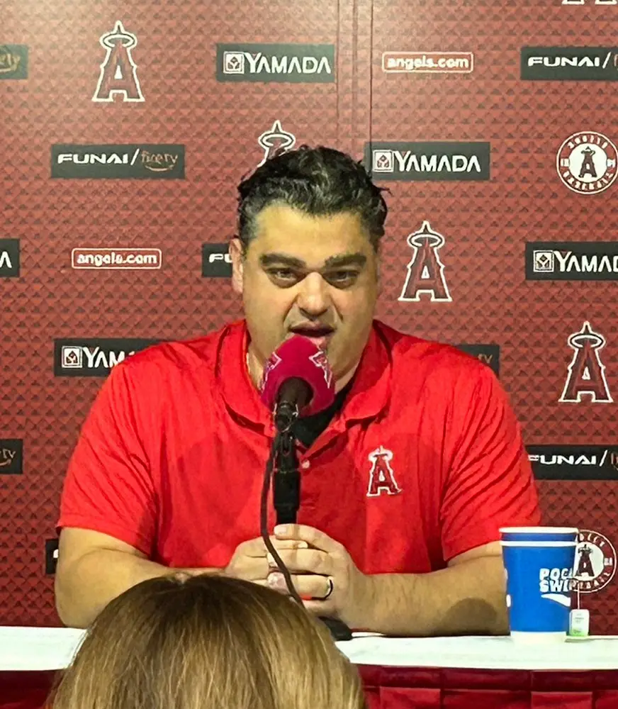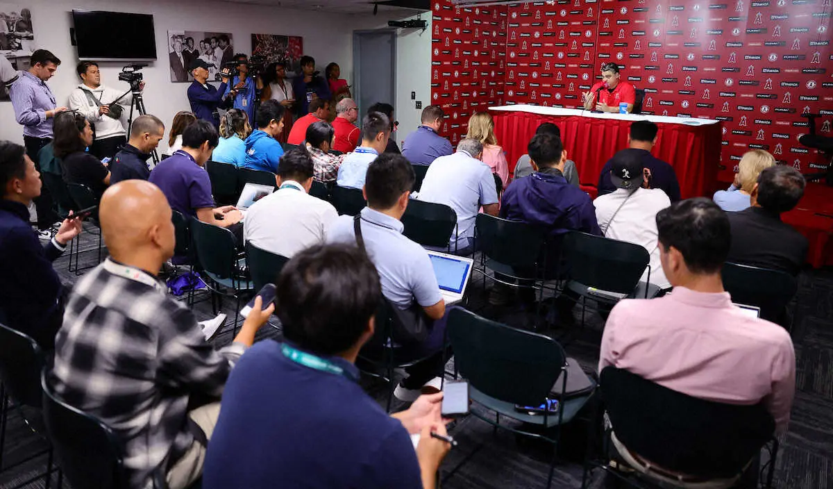 タイガース戦の前、報道陣の前で会見するエンゼルス・ミナシアンGM(撮影・光山 貴大)
