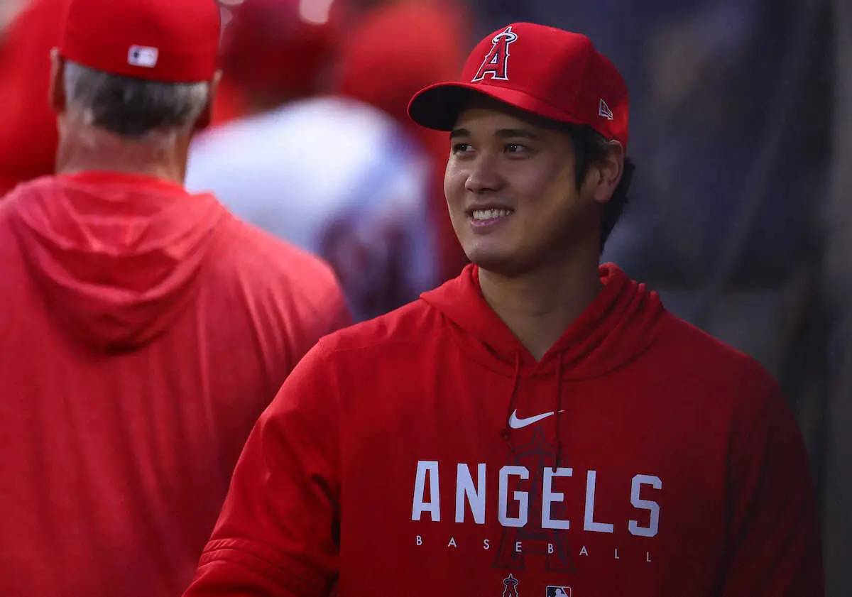 <エンゼルス・タイガース>試合中、ベンチに姿を見せた大谷(撮影・光山 貴大)