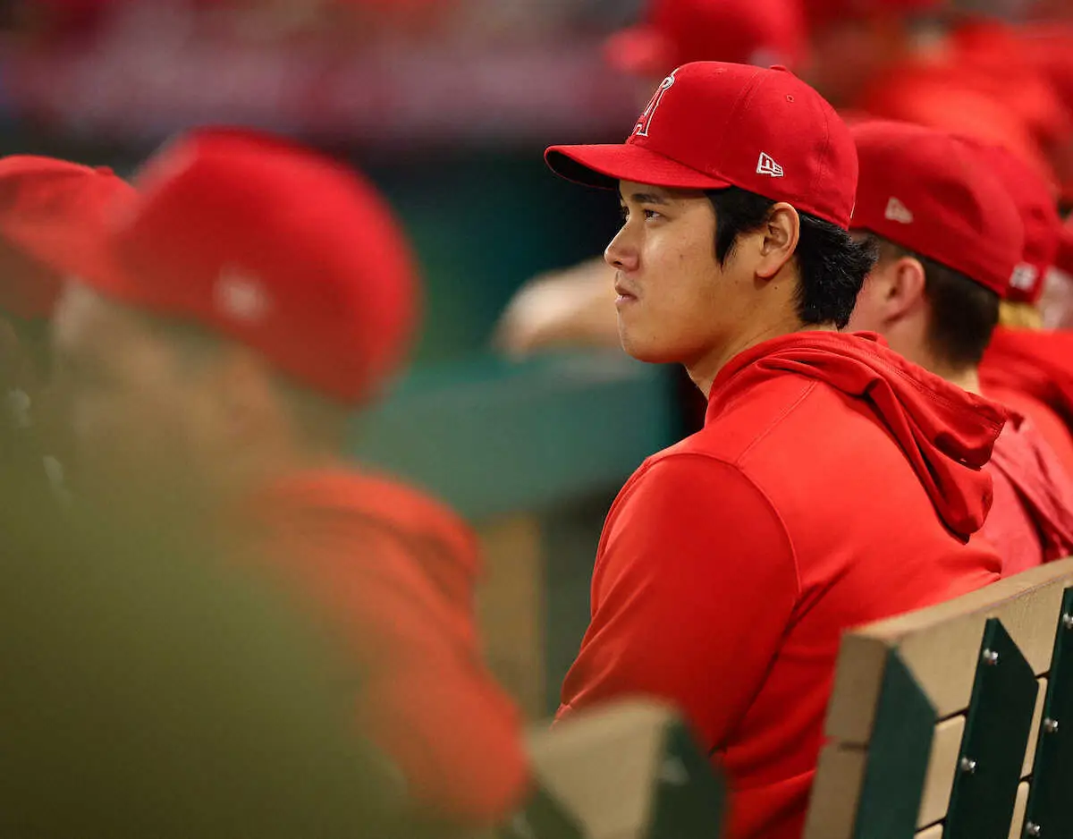 <エンゼルス・タイガース>試合中、ベンチの大谷(撮影・光山 貴大)