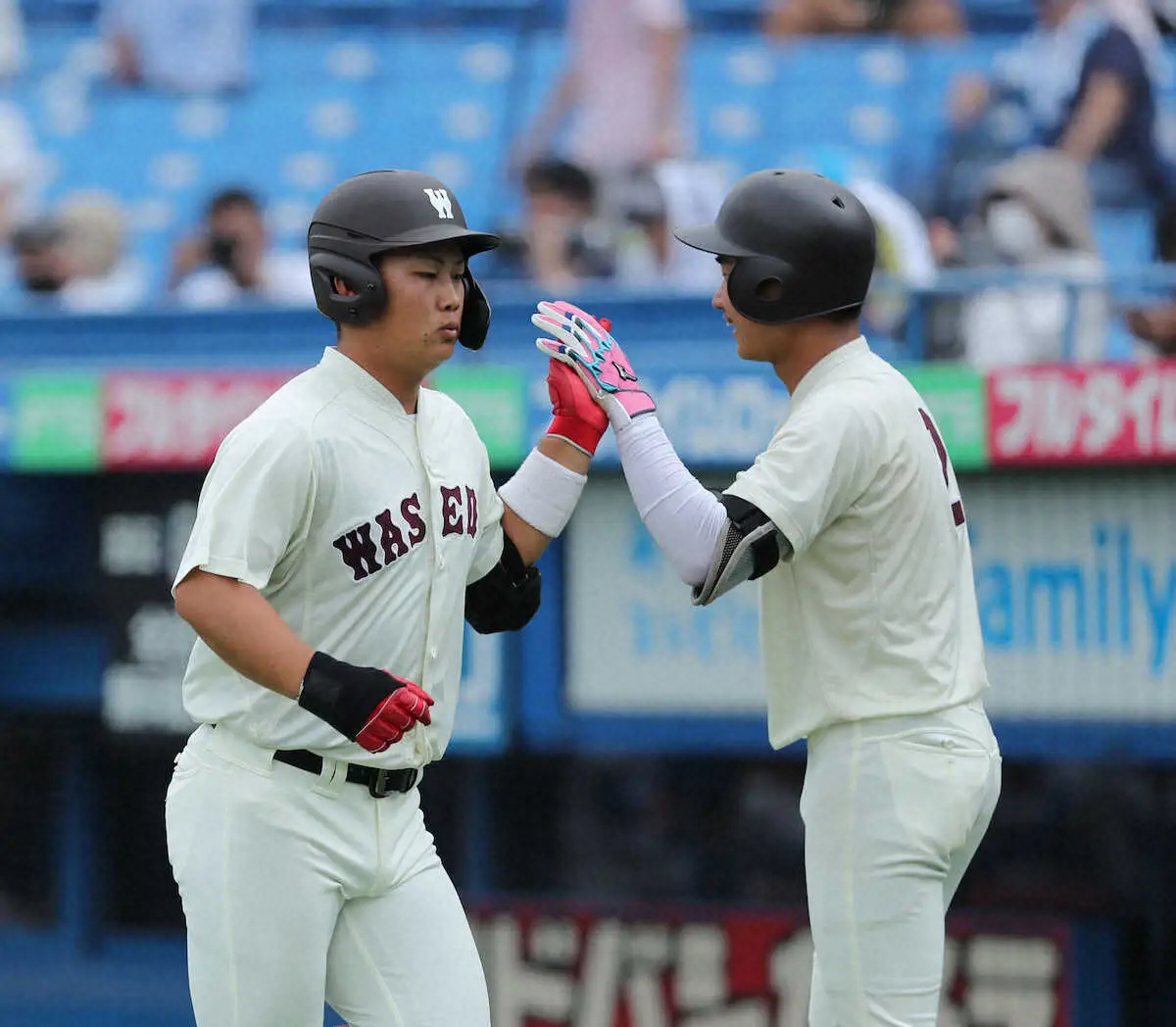 <東大・早大>6回、2ランを放ち生還しハイタッチをする早大・島川(左)(撮影・大城 有生希)
