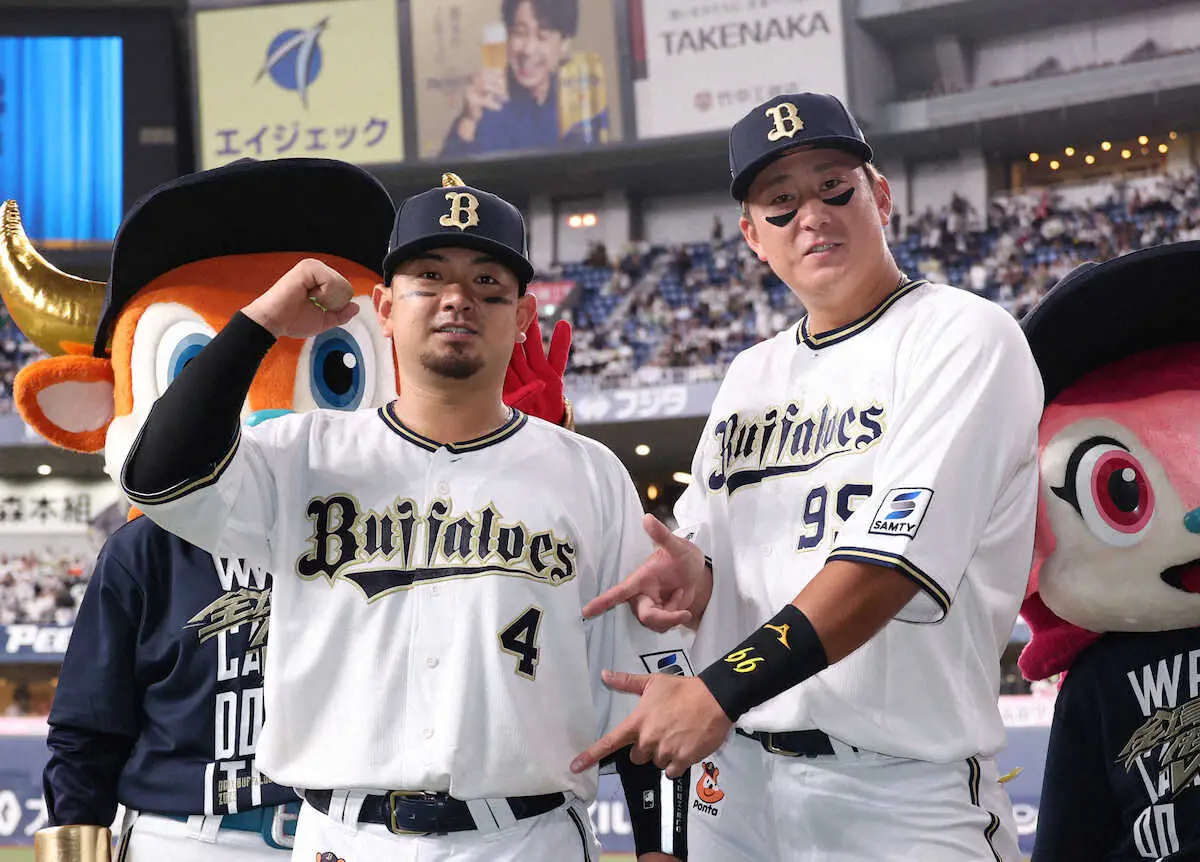 <オ・楽>マジック4となり森(左)の番号4を指さす杉本(撮影・後藤 正志)