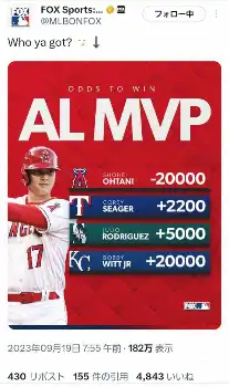 エンゼルス・大谷 MVP獲得オッズは1.005倍!!2位レンジャーズ・シーガーは23倍