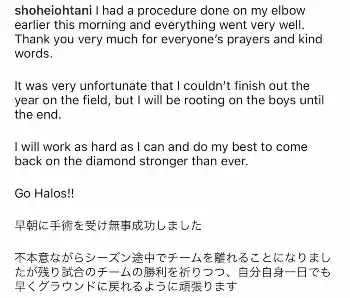 大谷も自身のインスタグラムを更新し「早朝に手術を受け無事成功しました。不本意ながらシーズン途中でチームを離れることになりましたが残り試合のチームの勝利を祈りつつ、自分自身一日でも早くグラウンドに戻れるように頑張ります」と日本語と英語でつづった。