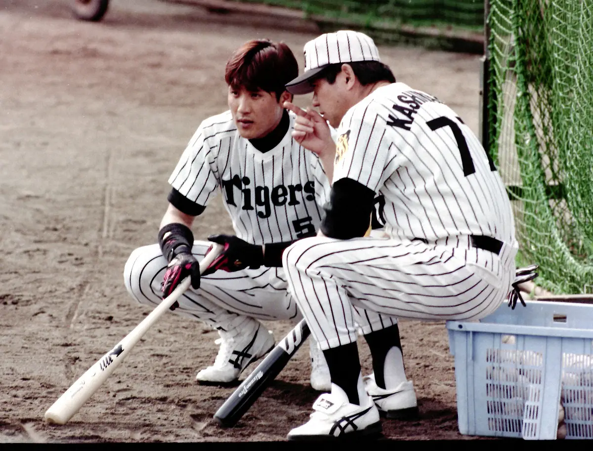 阪神コーチ時代の柏原純一氏(右)と新庄剛志