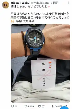 涌井は26日のマツダでの広島戦での先発が予告されているため、フォロワーからは激励の声とともに「G-SHOCK カッコいいですね」「素敵な贈り物ですね!」「大島さんからの時計良いですね」「大島選手、流石ですねぇ」などの声が上がっていた。