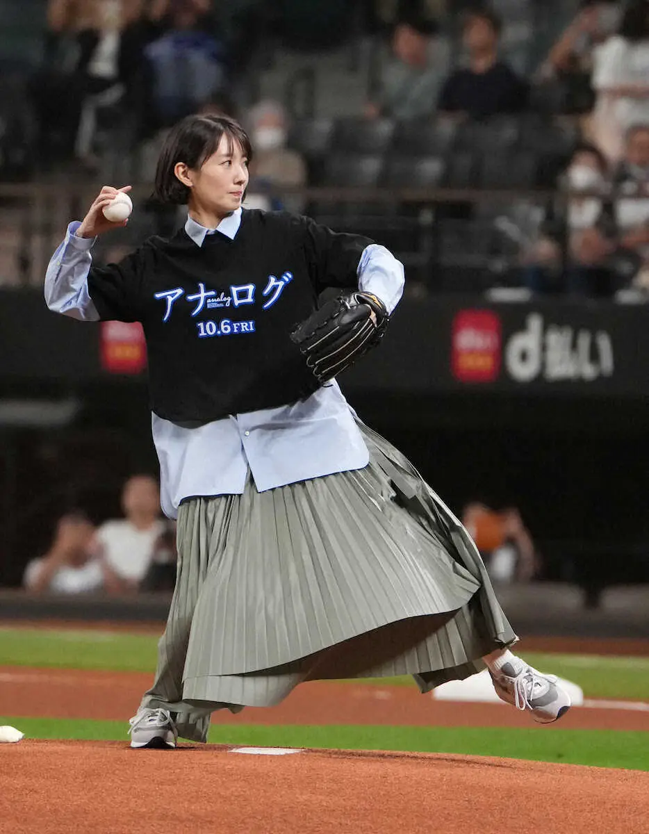 10月6日の映画「アナログ」でヒロイン役を務める女優の波瑠が27日、日本ハム―ロッテ戦(エスコン)でファーストピッチセレモニーを行った。