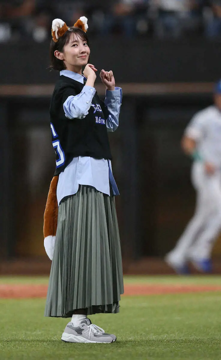 波瑠は自身がヒロイン役を務める映画の公開日である「10・6」が背中にプリントされた黒いシャツを着用してグラウンドに登場。自身2度目の始球式を行い会場を沸かせると、“お約束”となるきつねダンスの場面ではファイターズガールと同じくきつねの耳と尻尾をつけグラウンドに再登場。期待のダンスこそ披露しなかったものの、恥ずかしそうに観客の声援に応えながらカメラに向かって両手の指できつねポーズを決めるサービスショットを披露。ダンスBGMが終了すると、ファイターズガールとともに笑顔でグランドを後にした。