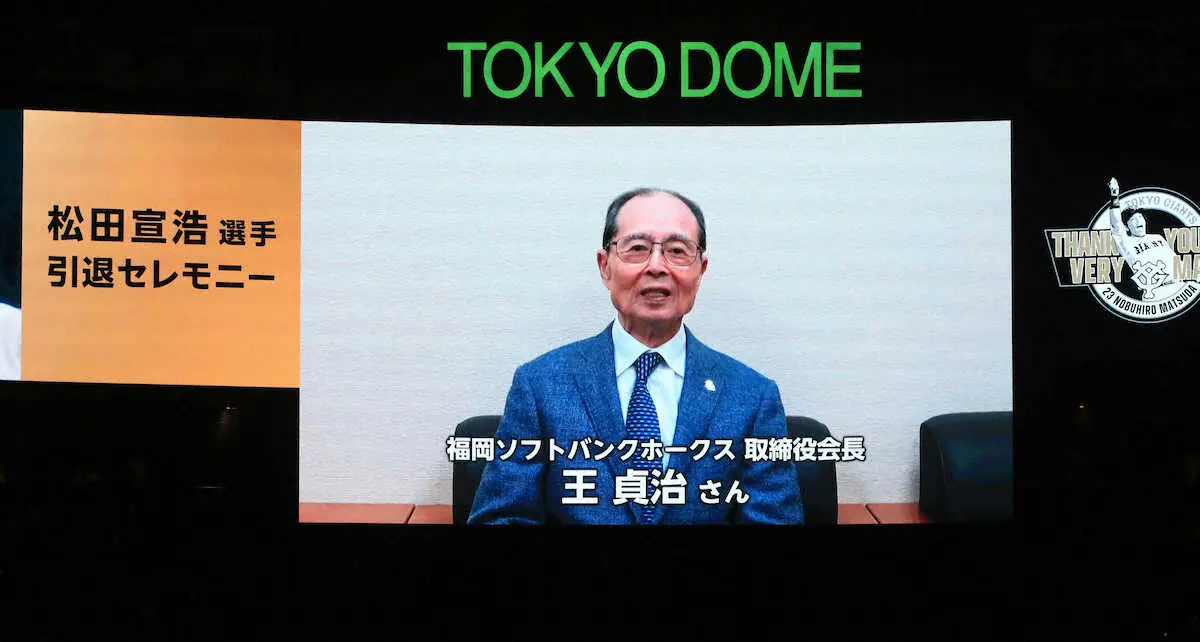巨人の松田宣浩内野手(40)が1日に行われたヤクルト戦(東京D)の試合後、引退セレモニーに臨み、昨季まで17年間プレーした古巣・ソフトバンクの王貞治会長(83)ら恩師から届いた映像で労いの言葉をかけられた。