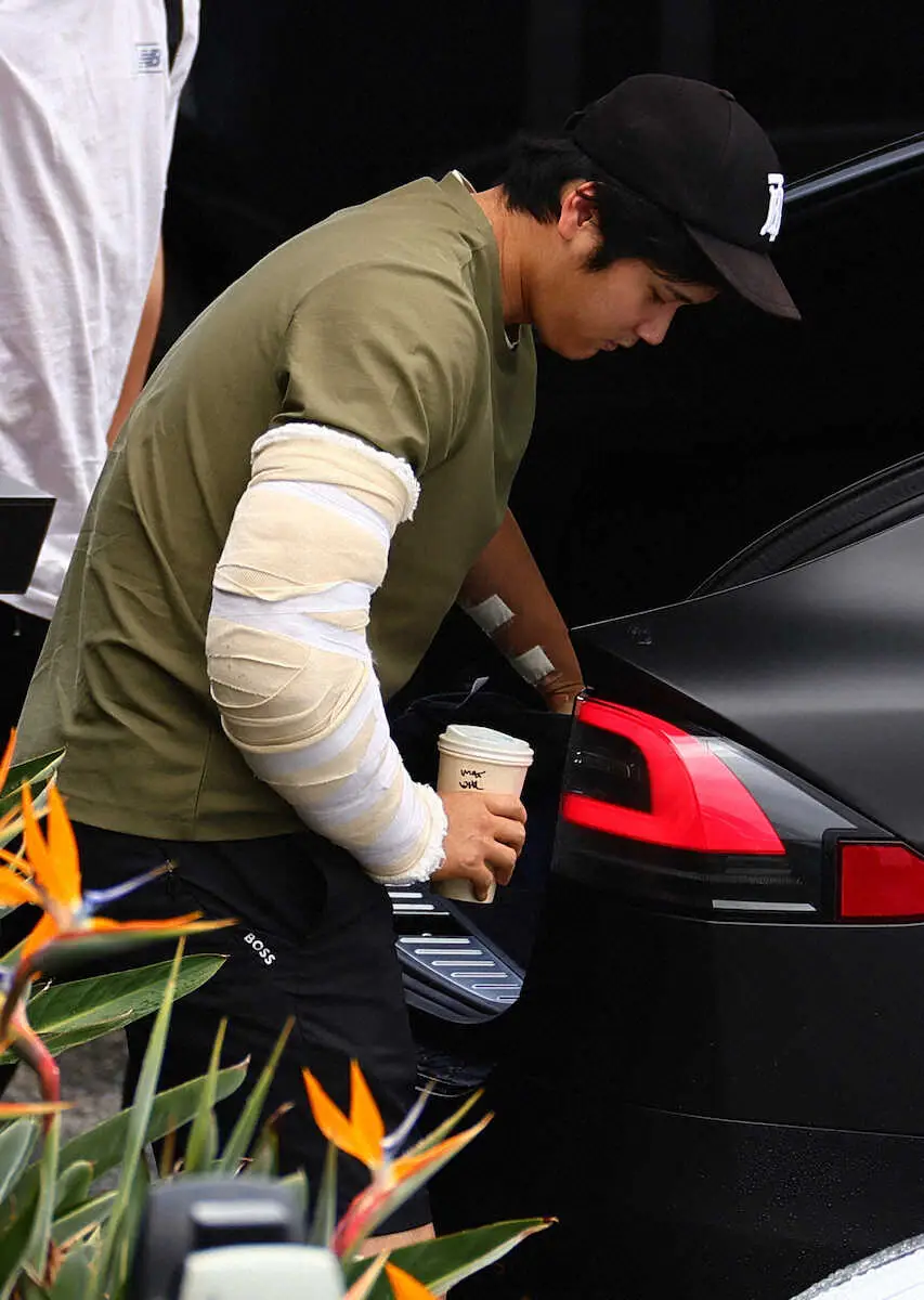 試合開始約1時間前の午前10時55分に水原通訳が運転する車で球場入り。カーキのTシャツ姿、黒い帽子を被り、右肘は前日同様、ギプスで固定され包帯の様なものが巻かれていた。