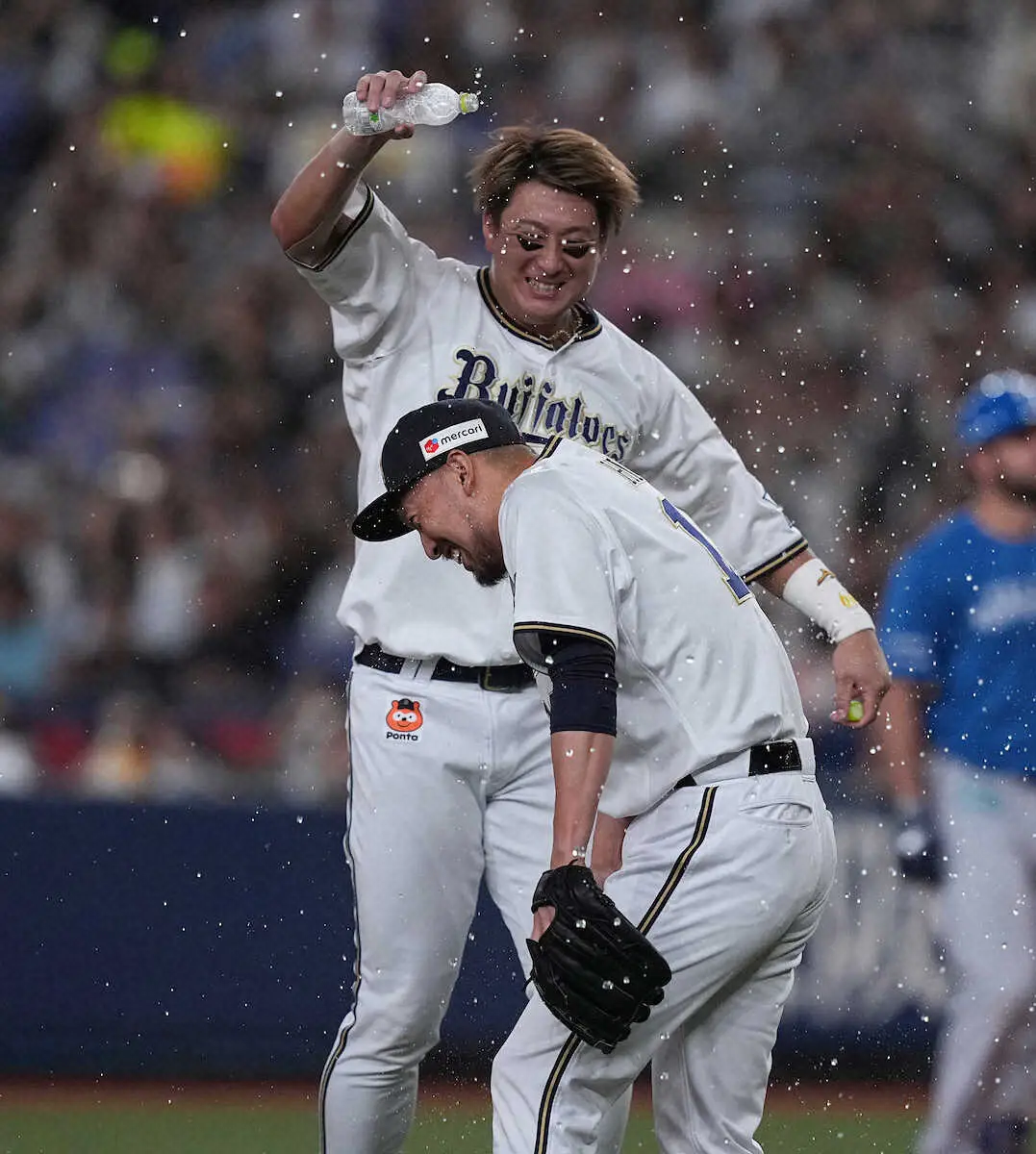 <オ・日>日米通算250セーブを達成し、杉本(奥)にウオーターシャワーで祝福される平野佳(左)(撮影・平嶋 理子)