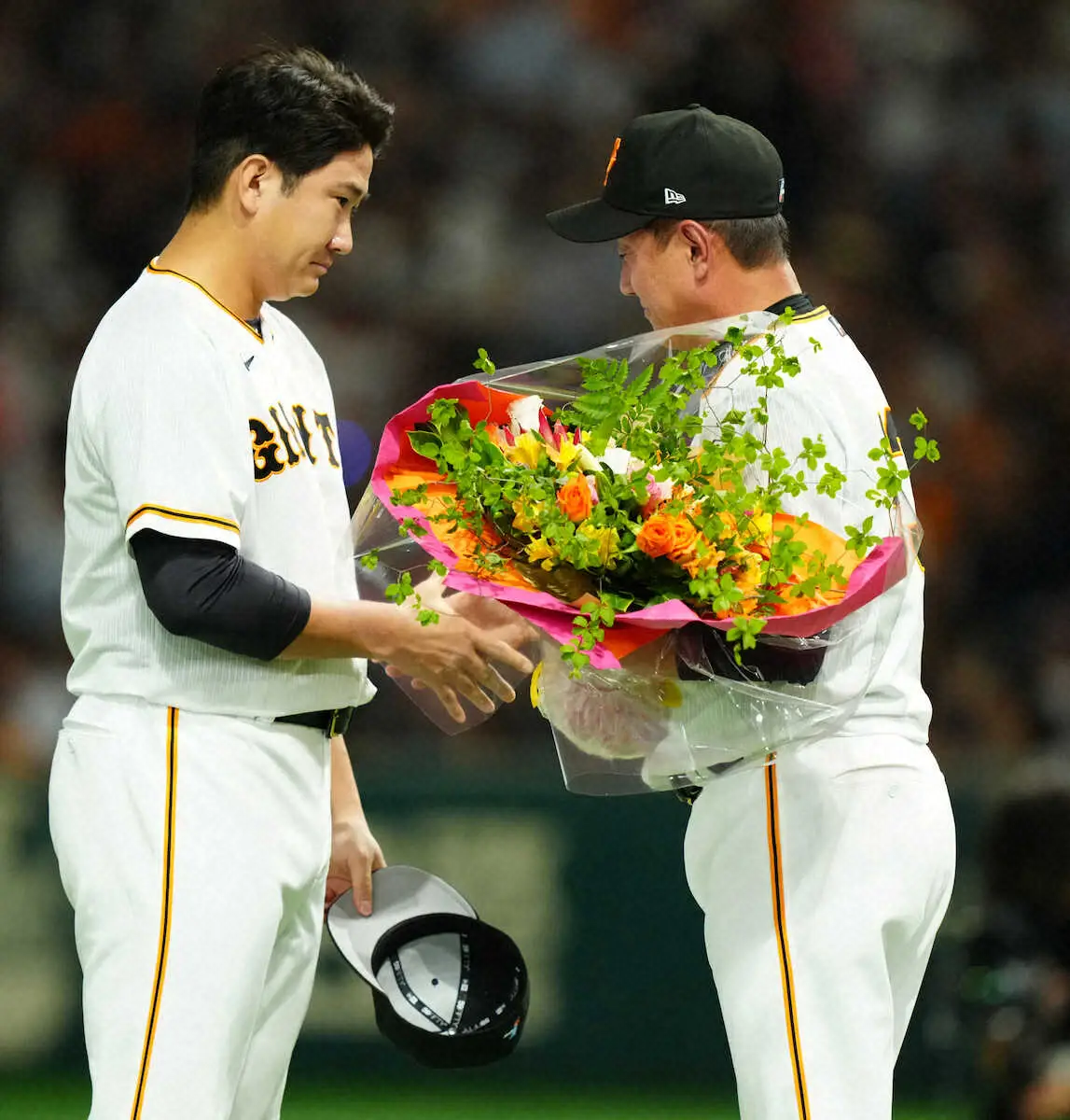原監督のスピーチ後、指揮官への花束贈呈役を務めた菅野はさすがに涙。同じく花束を贈呈した坂本勇人内野手(34)の目にも涙が浮かび、指揮官との別れを惜しんでいた。