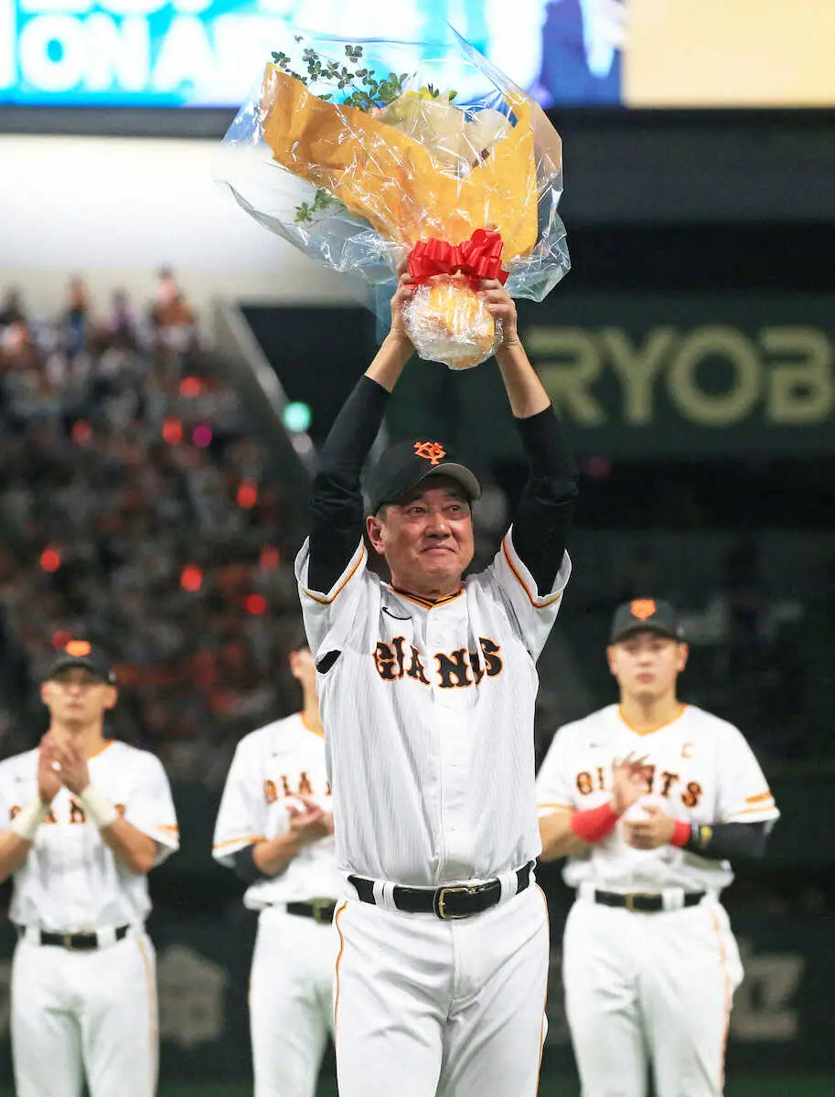 <巨・D>退任する原監督は贈られた花束を掲げる(撮影・西川祐介)