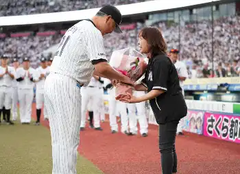 <ロ・オ>場内アナウンスを卒業する谷保恵美さん(前列中央)と記念撮影するロッテナイン(撮影・沢田 明徳) Photo by スポニチ ロッテ・谷保さん2100試合目“最後の”アナウンスで涙、涙…場内は谷保コール… ギャラリーで見る この記事のフォト 2023年10月07日の画像一覧 もっと見る 2023年10月07日の画像をもっと見る