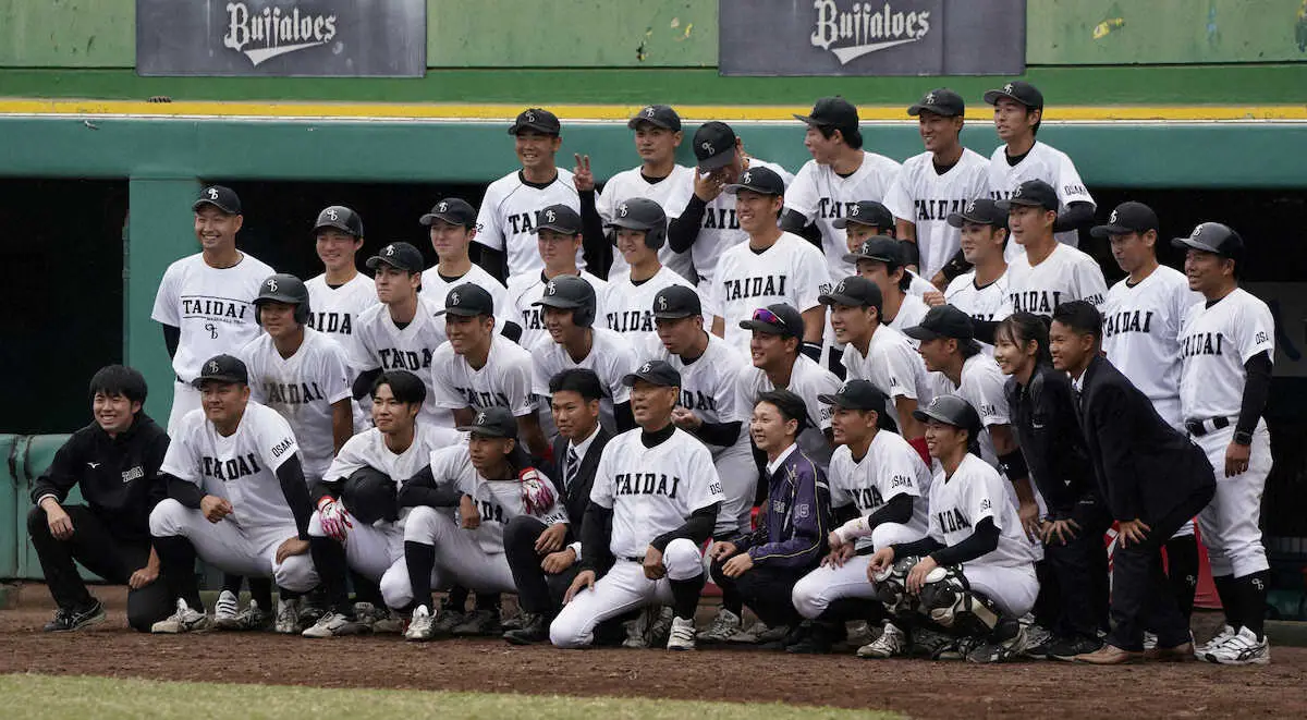 <関国大・大体大>退任の決まった、大体大・中野監督を中心に写真撮影(撮影・中辻 颯太)