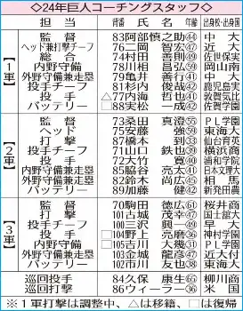 阿部監督は「強い巨人軍、愛される巨人軍をつくるべく、チーム一丸で戦っていきたい」と話していた。亀井打撃コーチは外野守備兼走塁コーチとして、実松一成スカウトはバッテリーコーチとして入閣する。1軍首脳陣は「公表時期調整中」の打撃コーチを除き、平均年齢45・6歳と、20年以来のリーグ優勝奪回へ大幅に若返った。(川島 毅洋)