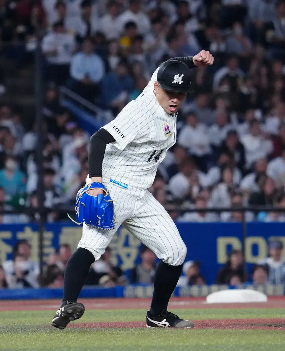 <ロ・ソ>6回、今宮を打ち取りガッツポーズする小島(撮影・長久保 豊)
