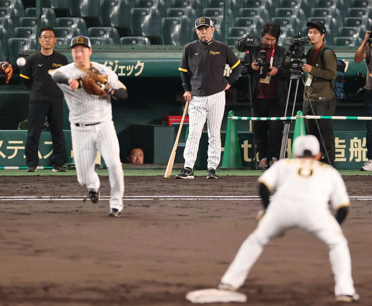 <阪神CSファイナル前日練習>シートノックを見つめる岡田監督(中)(撮影・椎名 航)