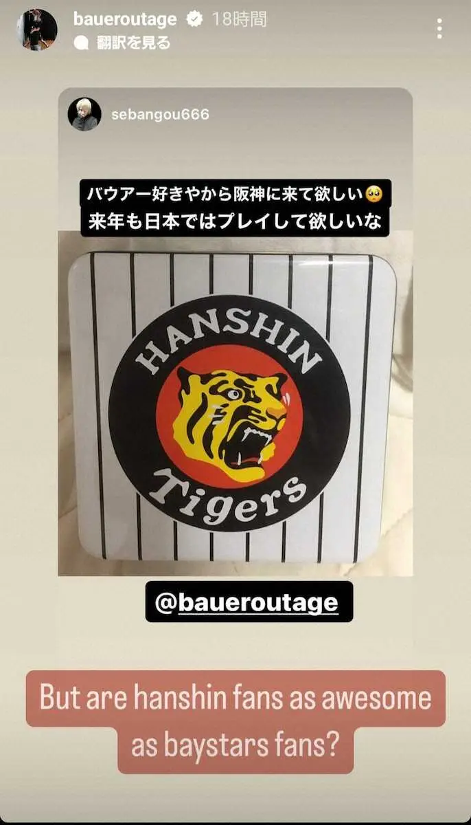 自身のインスタグラムでファンのメッセージに答えたDeNA・バウアー(本人のインスタグラムより) DeNA・バウアー 来季移籍“熱望”他球団ファンへSNSで逆質問「阪神ファンは… ギャラリーで見る この記事のフォト 2023年10月19日の画像一覧 もっと見る 2023年10月19日の画像をもっと見る