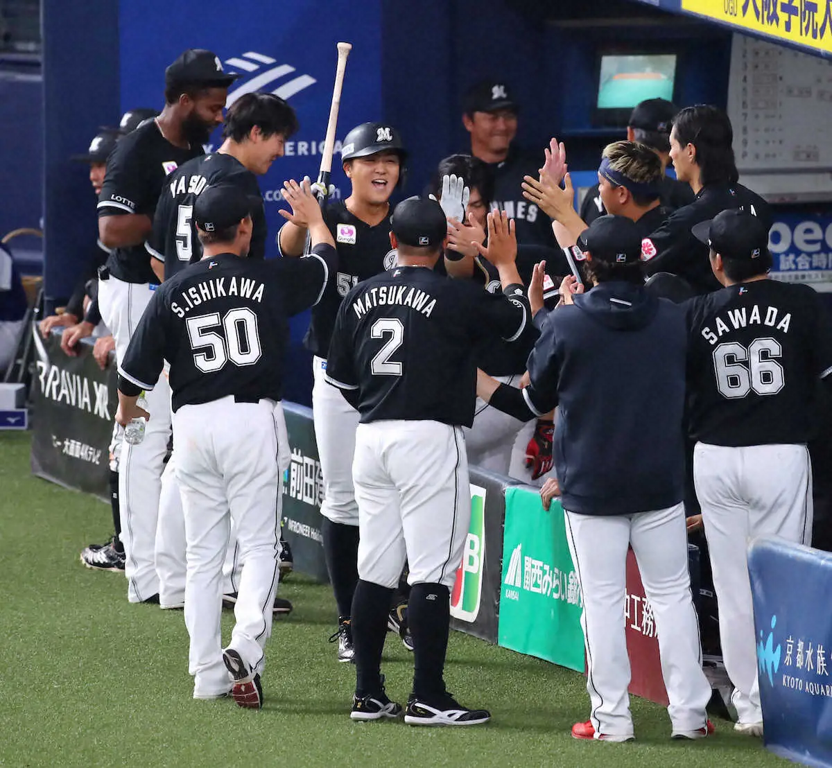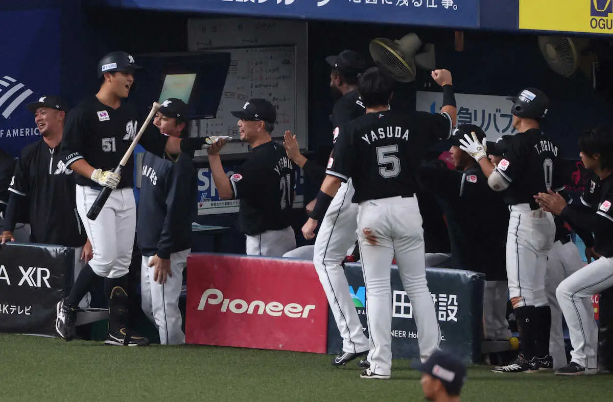 <オ・ロ>9回無死二塁、同点の適時二塁打を放った安田(手前)を迎えるロッテナイン(撮影・平嶋 理子) Photo by スポニチ ロッテが劇的な逆転勝利!CSファイナルの連敗「10」で止めた…朗希の登板ま… ギャラリーで見る この記事のフォト 2023年10月19日の画像一覧 もっと見る 2023年10月19日の画像をもっと見る