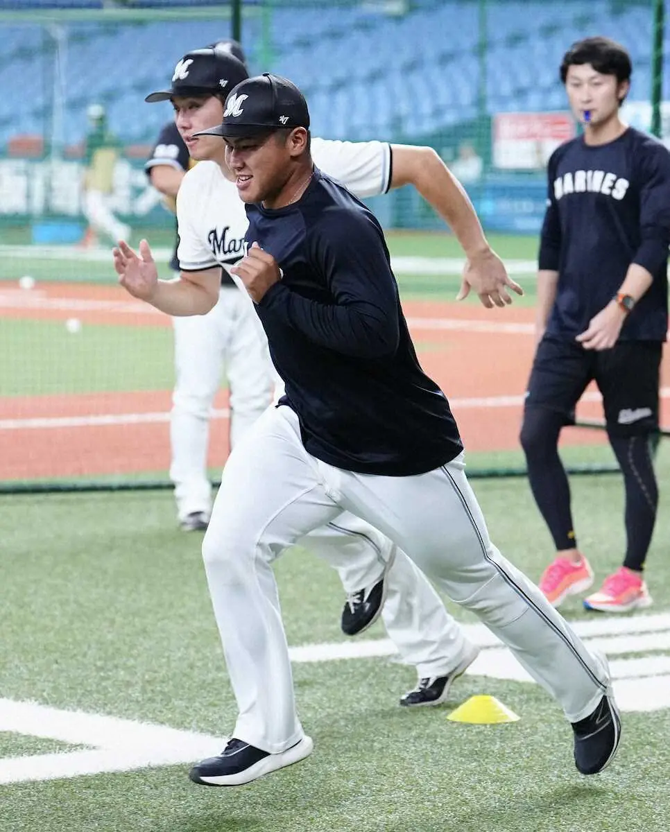 <オ・ロ>試合前、ダッシュする松川(撮影・長久保 豊)