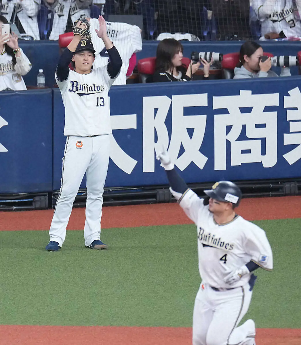 <オ・ロ>初回、先制弾を放った森に拍手を送る宮城(撮影・岸 良祐)