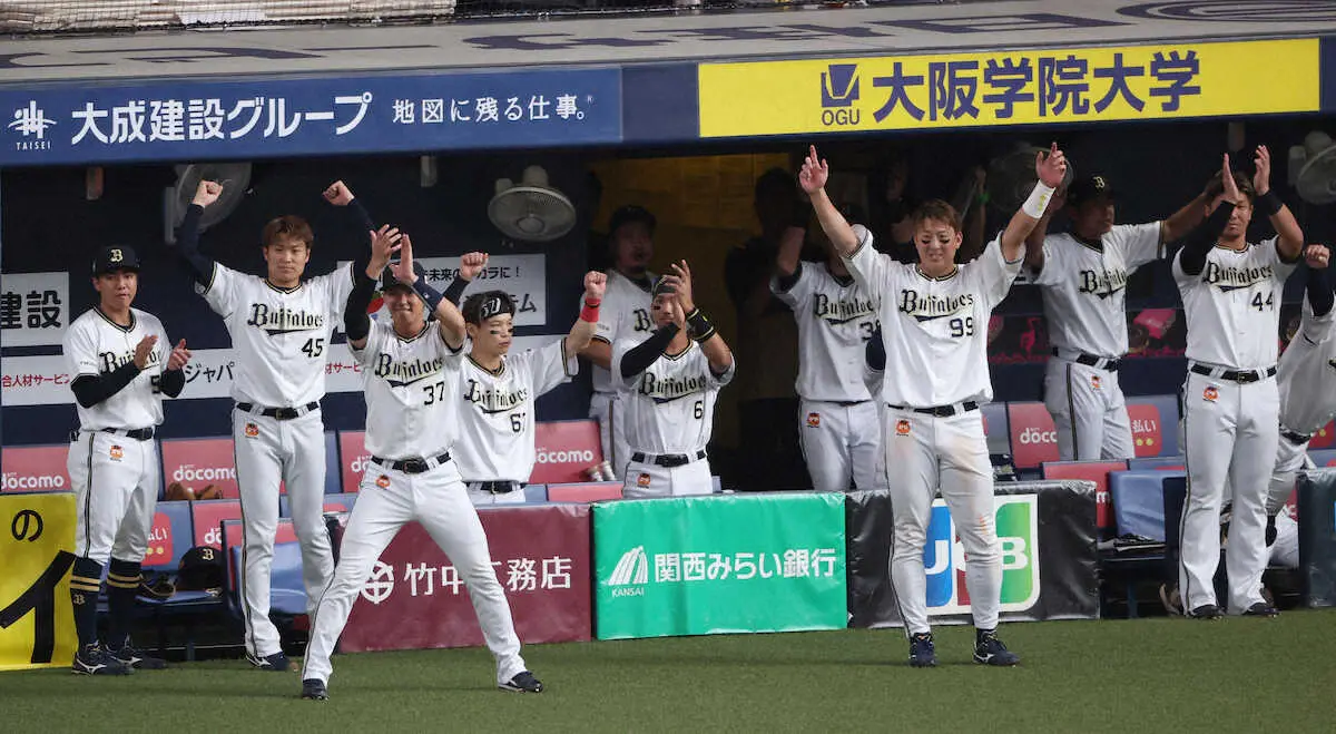 <オ・ロ>7回2死二塁、T-岡田の中前打に湧くオリックスナイン(撮影・平嶋 理子)