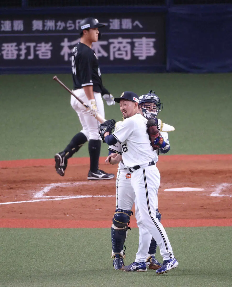 <オ・ロ>9回2死、山口を遊直に仕留め、日本シリーズ進出を決めて抱き合う平野佳(手前右)と若月(撮影・平嶋 理子)