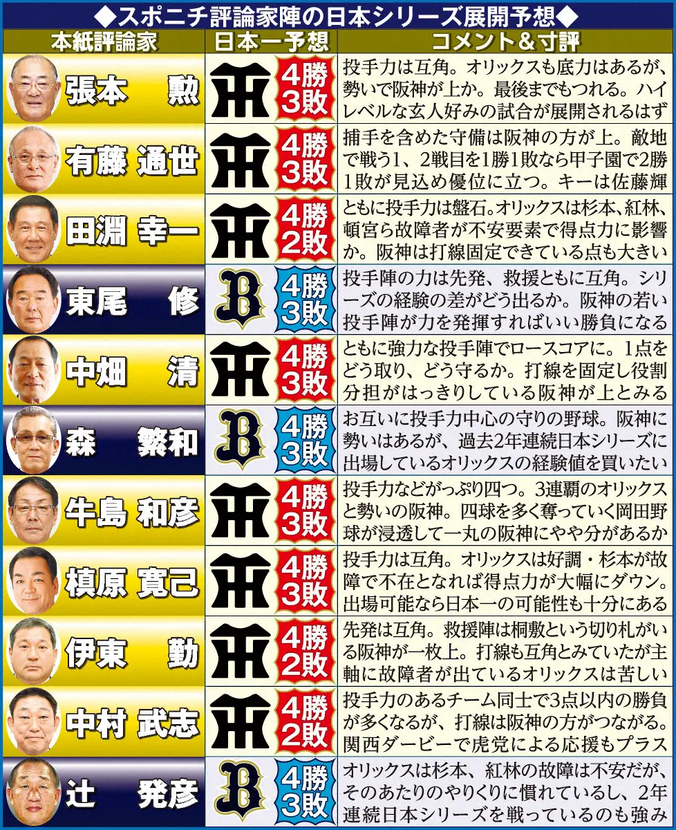 1964年の南海―阪神以来、59年ぶり2度目の関西対決となった日本シリーズ。ともにリーグ制覇を果たし、順当にクライマックスシリーズ(CS)ファイナルステージ(S)も勝ち抜いたオリックスと阪神の頂上決戦は28日からスタートする。関西はもちろん、全国の注目を集めそうな戦いを前に、スポニチ本紙評論家陣が“日本一早く”日本シリーズの勝敗を予想。11人中、実に8人が阪神の日本一を予想した。