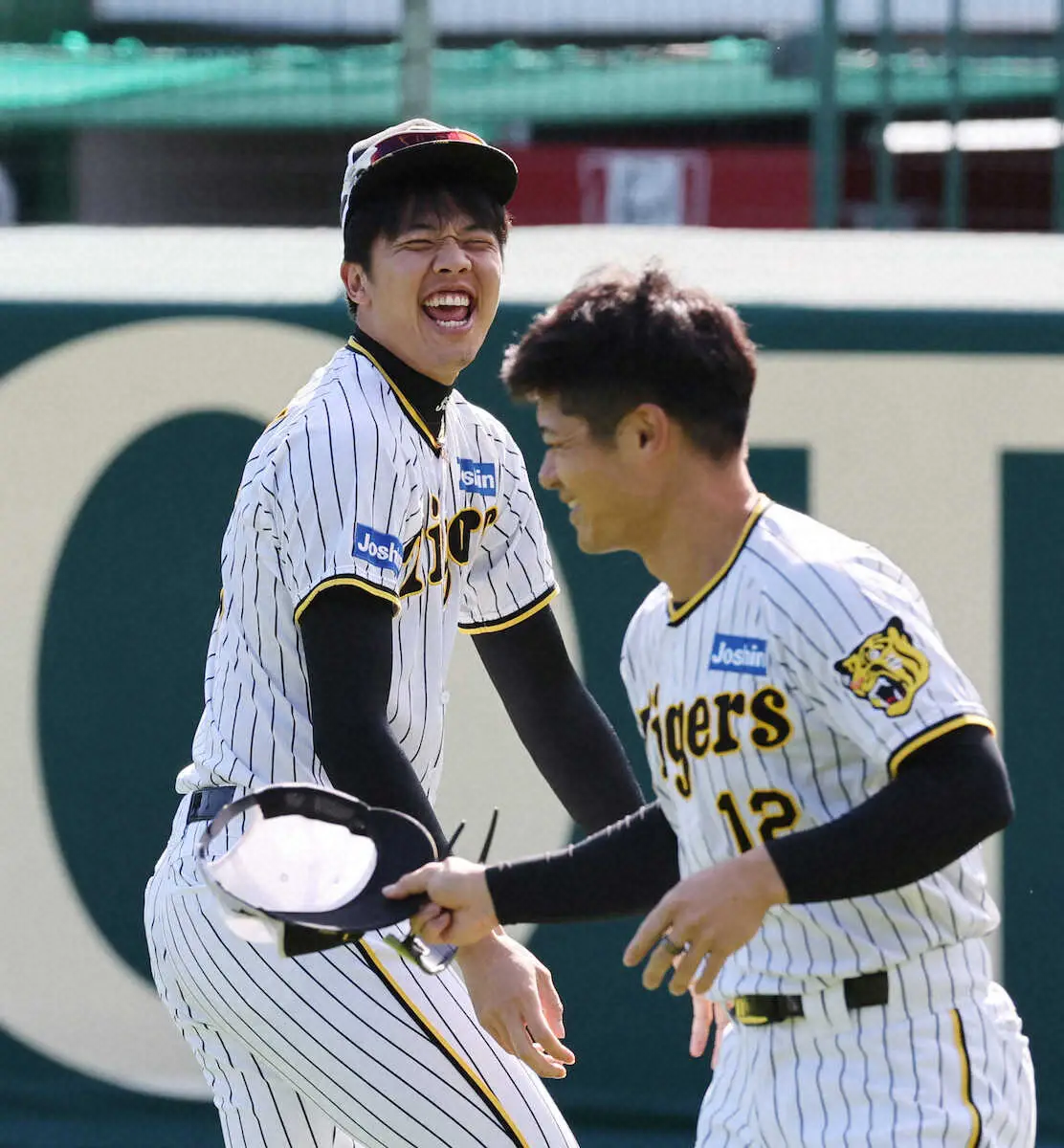 笑顔でウオーミングアップを行う阪神の才木(左)と坂本(撮影・大森 寛明)