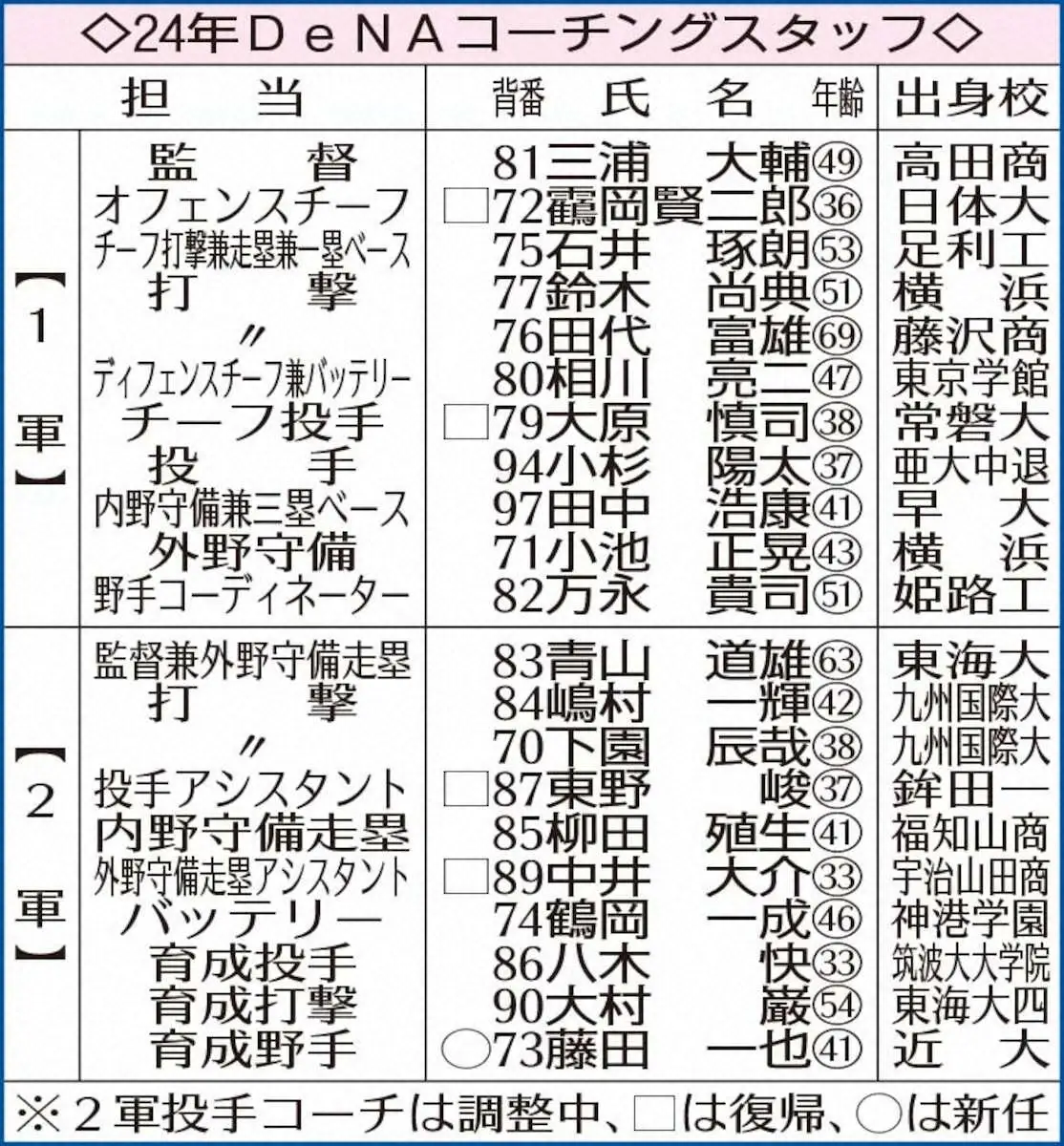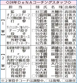 DeNAは23日、三浦大輔監督(49)就任4年目となる来季コーチ陣を発表した。1軍にヘッド格で攻撃作戦面を担当するオフェンスチーフコーチを新設。今季、1軍ゲームアナリストを務めた靍岡賢二郎氏(36)が就任する。