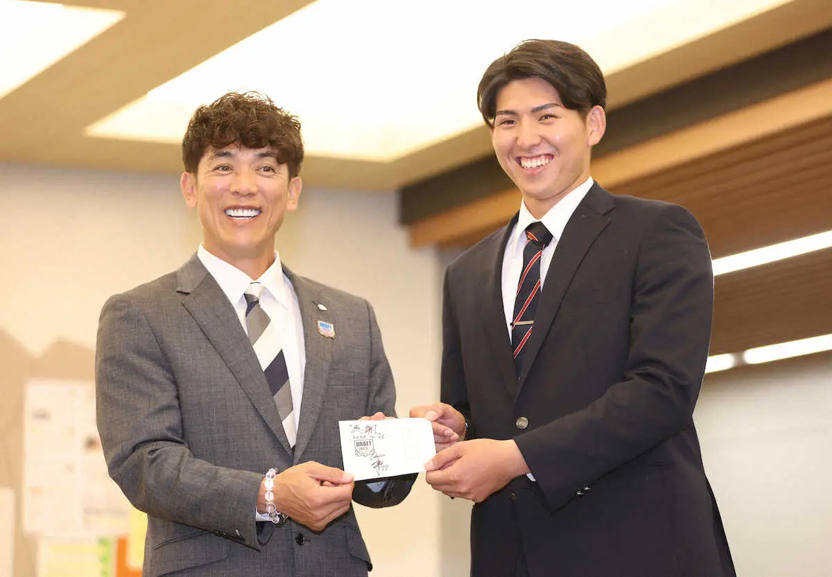 歓喜の雄叫びが冷めやらぬ中、松井監督が国学院大を訪問。武内に電撃あいさつした。交渉権の当たり札を手渡し「映像とか見ていたけど…男前やな!男前」と笑顔で語り掛け、左腕の緊張をほぐした。