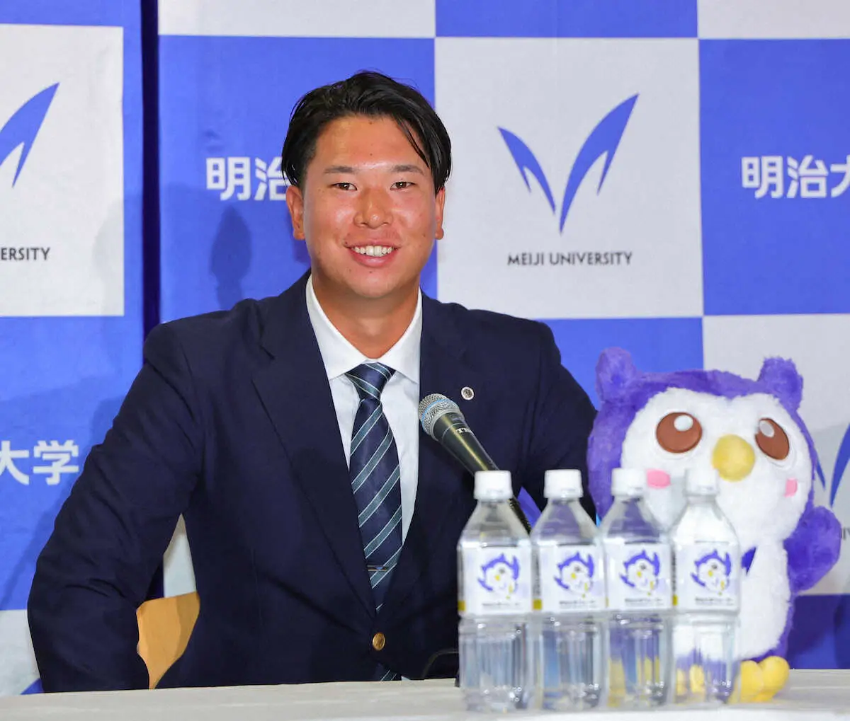 <2023年プロ野球ドラフト会議>ロッテに1位で指名され笑顔を見せる明大・上田(撮影・藤山 由理)