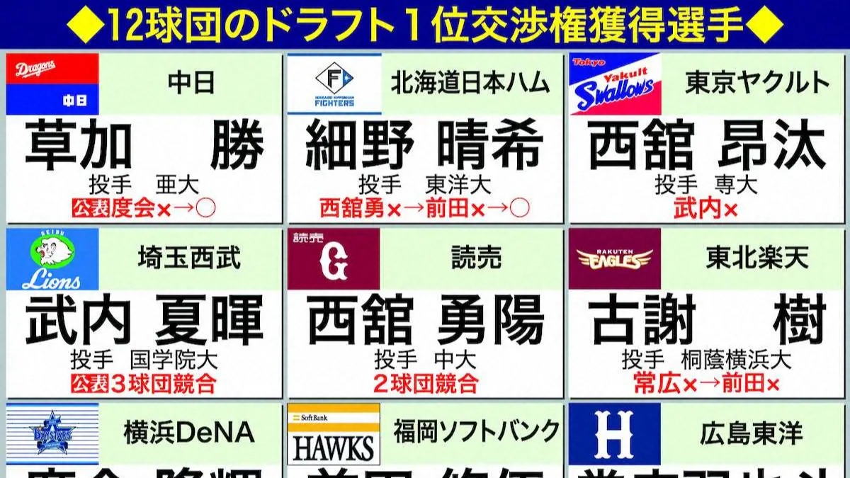 ENEOS・度会隆輝外野手(22)、中大・西舘勇陽投手(21)ら人気の選手が多く、1巡目入札で抽選7回はドラフト会議史上最多。また、1位には東都大学野球リーグの選手が7人指名され、同一リーグからは史上最多となった。