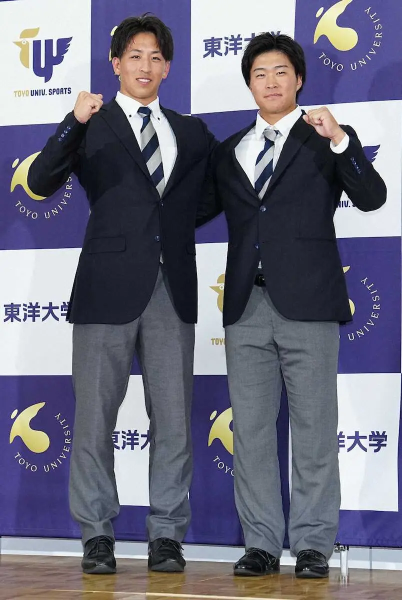 東洋大白山キャンパスの会見場では、日本ハムから1位指名を受けた細野と一緒に選手が記念撮影をしていた。