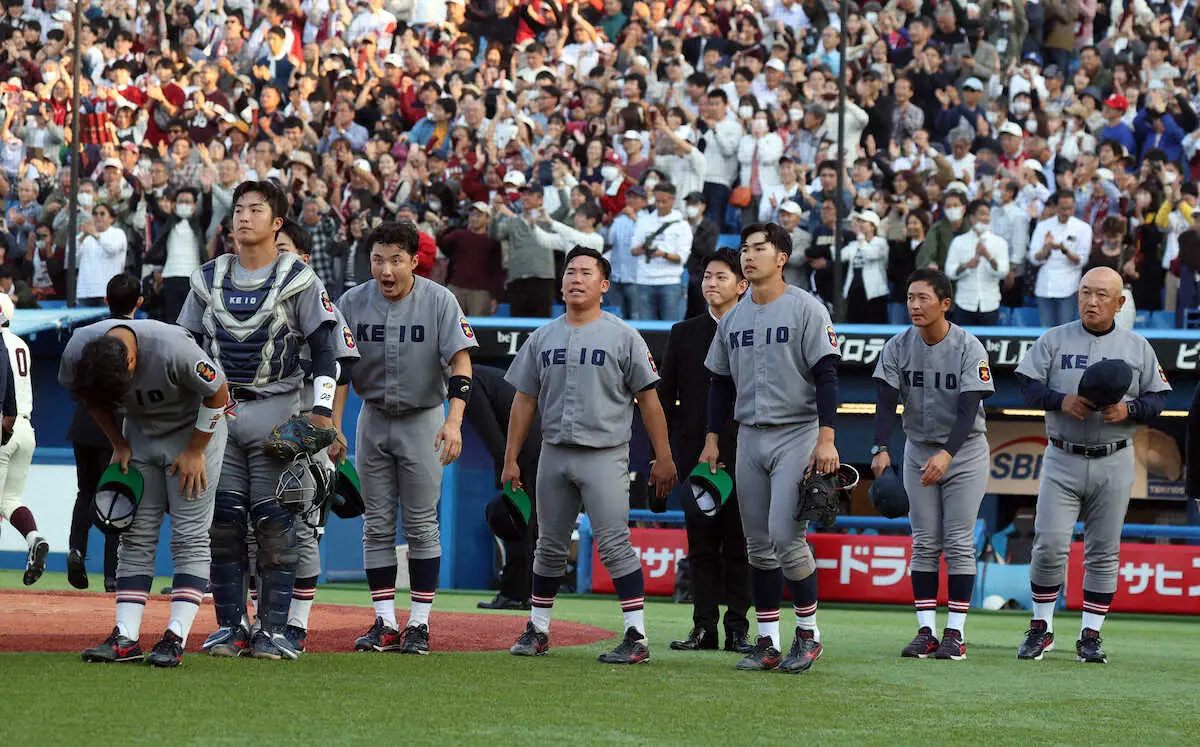 <慶大・早大>あいさつするサヨナラ負けの慶大ナイン(撮影・久冨木 修)
