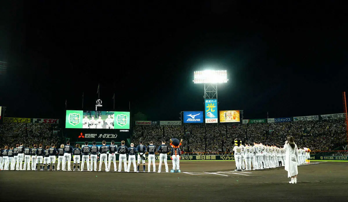 <神・オ>山本彩の国歌独唱を聞く両チーと、黄色く染まった甲子園のスタンド(撮影・光山 貴大)
