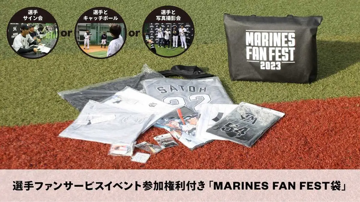 19日にZOZOマリンスタジアムで開催されるファン感謝デー「MARINES FAN FEST 2023」で実施するファンサービスイベント参加権利とレプリカユニホームやフェイスタオル、アパレルなど計12点の商品が封入された福袋で、「サイン会付き MARINES FAN FEST袋」「選手とキャッチボール付きMARINES FAN FEST袋」「写真撮影会付きMARINES FAN FEST袋」の3種類で展開される。