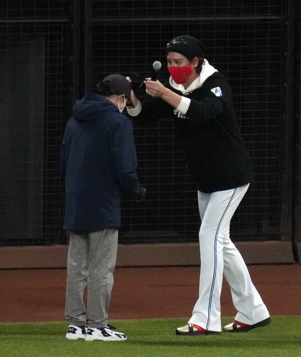 日本ハムの新庄監督が予告通り、練習後にファンサービスを行った。抽選で選ばれた20人がマウンドから球を投げ、本塁に立てられたバットに当てる企画に挑戦。成功した女性ファンに新庄監督が着用した帽子やユニホームなどが贈られた。