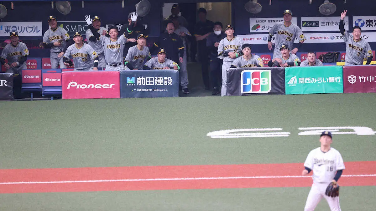 日本シリーズ<オ・神(6)>4回表2死一、三塁、近本の大飛球に盛り上がった阪神ナインだったが、森の好守に阻まれる(撮影・北條 貴史)