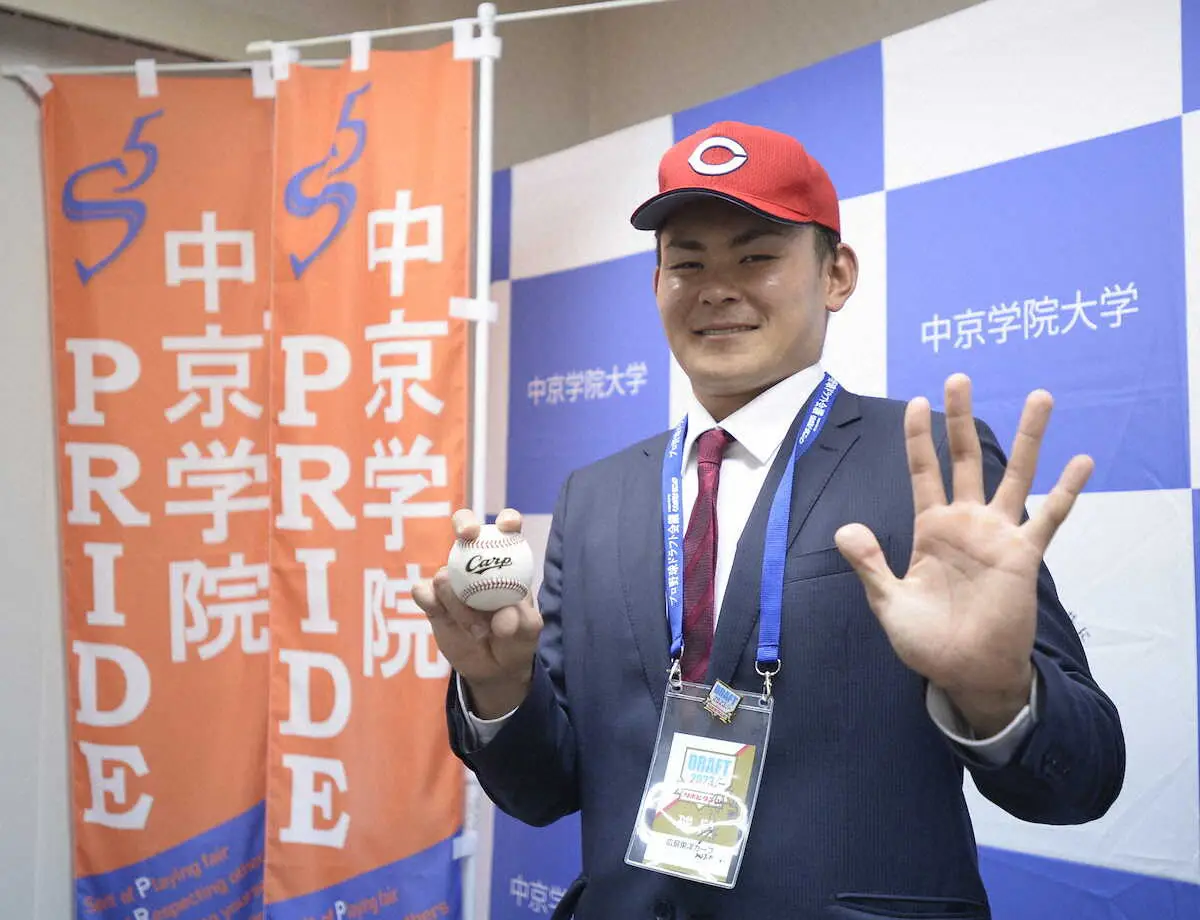 大きな手を広げてポーズを取る広島ドラフト5位の中京学院大・赤塚健利