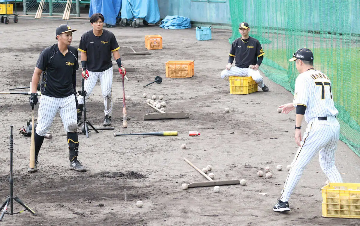 阪神の安芸秋季キャンプ第3クール初日が行われ、来季のさらなる飛躍を期す井上と前川の両大砲候補が今岡打撃コーチから熱血指導を受けた。