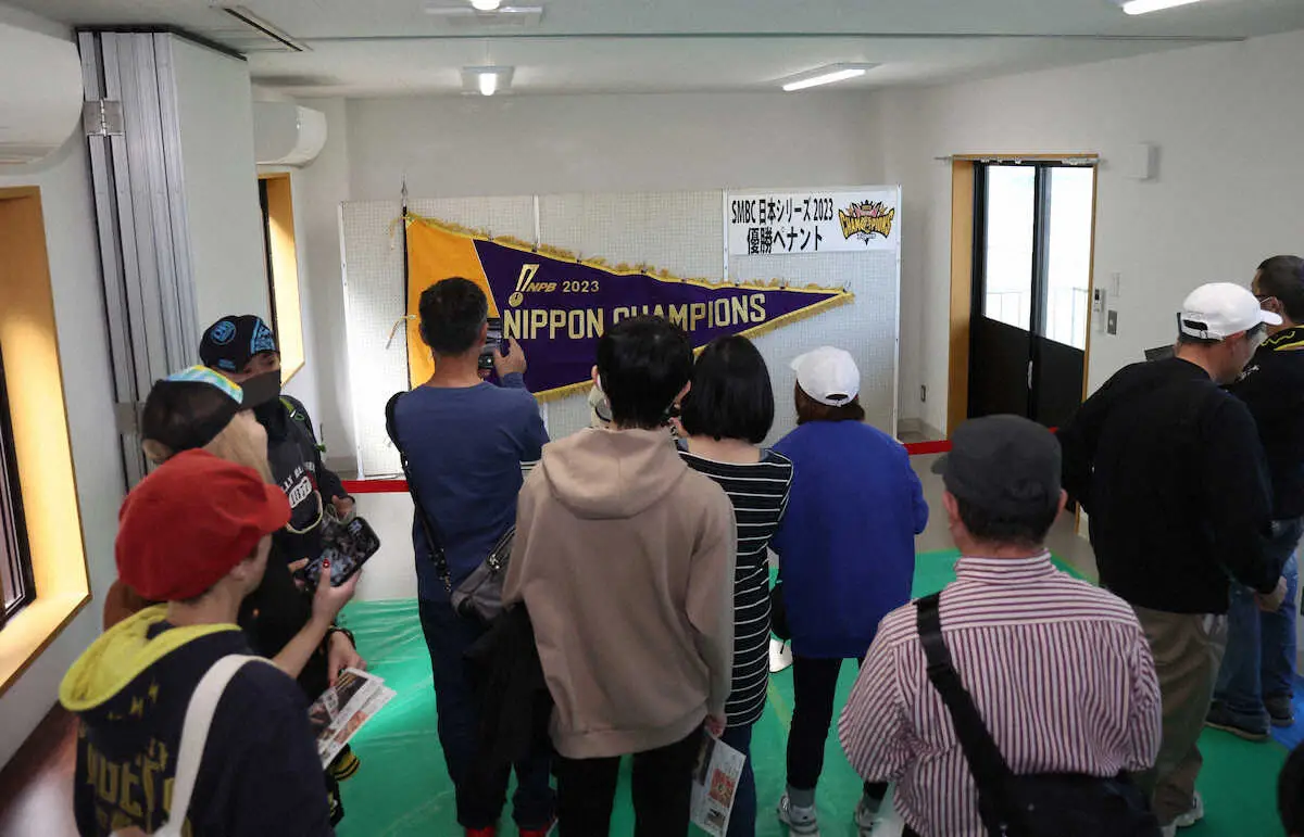 <阪神秋季キャンプ>優勝ペナントを見る阪神ファン(撮影・須田 麻祐子)