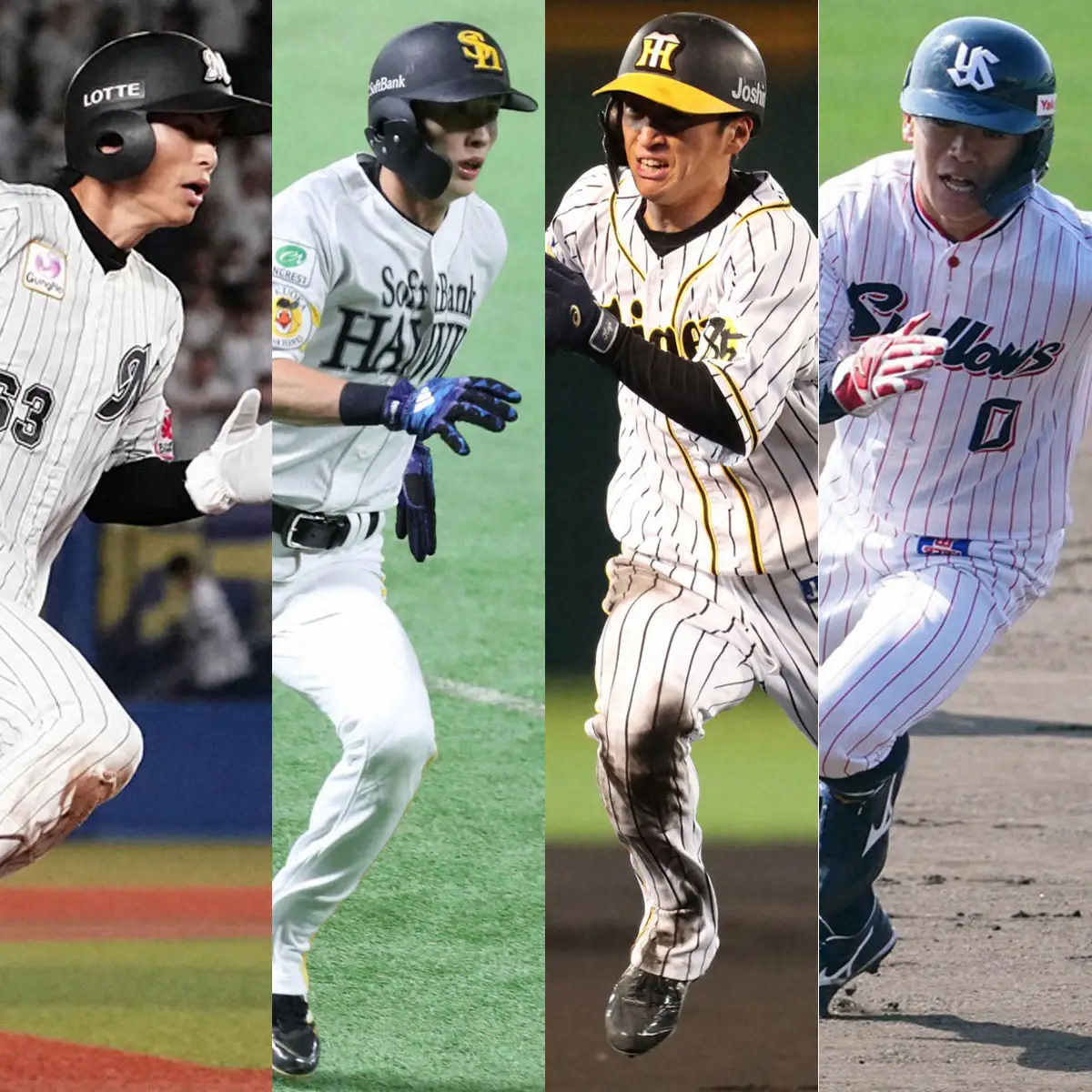 (左から)ロッテ・和田康、ソフトバンク・周東、阪神・近本、ヤクルト・並木