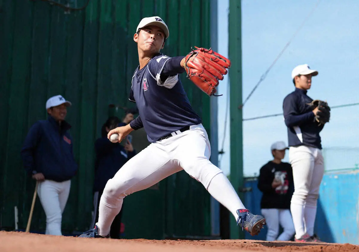 午前8時に練習開始。昼過ぎに授業を控える外丸は急ぎ足でブルペンに登場だ。「プレー!」の合図でいざ、お手合わせ。初球は右打者のアウトローへ決まる136キロ直球。スピードガンの数字以上の勢いを感じさせた。