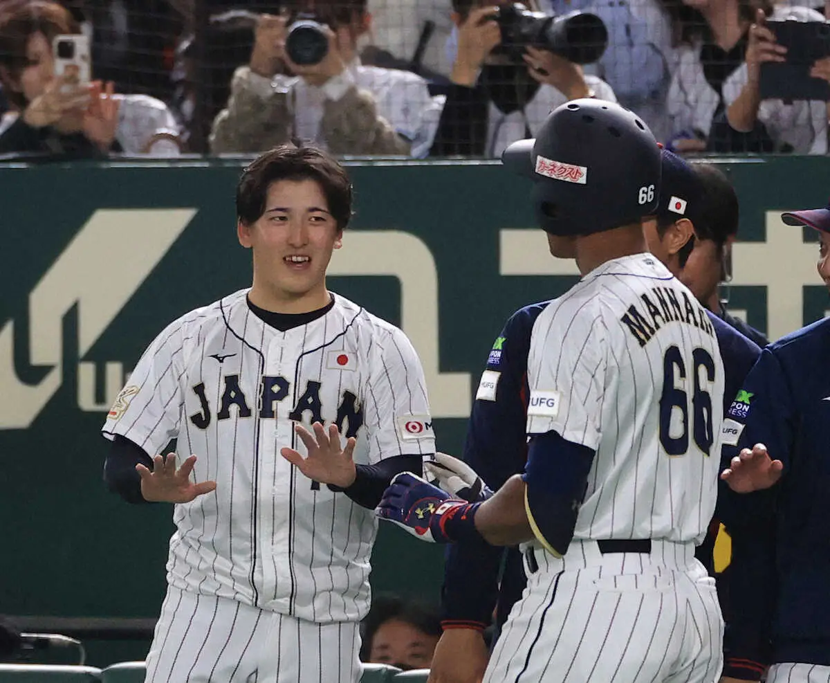 <日本・韓国>4回、ソロを放った万波(右)を迎える井端監督(撮影・藤山 由理) Photo by スポニチ 新生侍ジャパン 韓国討ちで決勝進出決定!万波が特大バックスクリーン弾… ギャラリーで見る この記事のフォト 2023年11月17日の画像一覧 もっと見る 2023年11月17日の画像をもっと見る